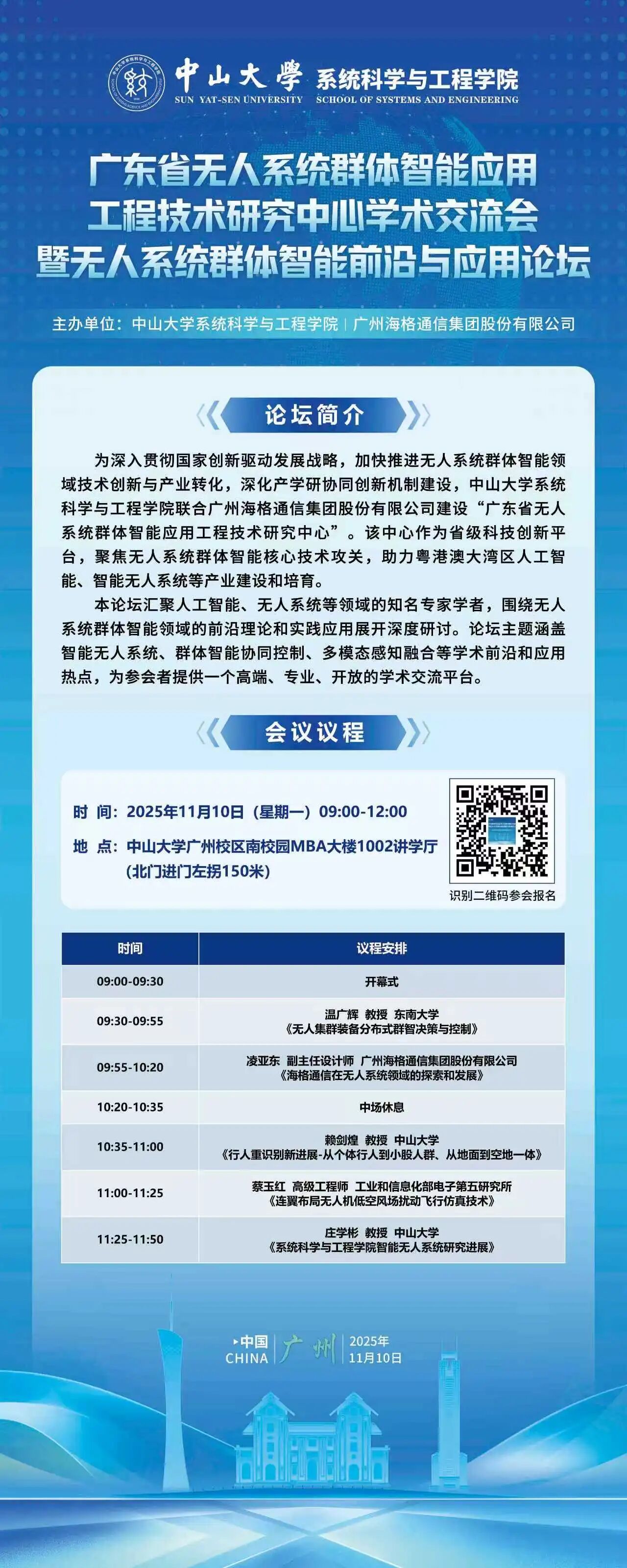 为深入贯彻国家创新驱动发展战略,加快推进无人系统群体智能领域技术创新与产业转化,深化产学研协同创新机制建设,中山大学系统科学与工程学院联合广州海格通信集团股份有限公司建设“广东省无人系统群体智能应用工程技术研究中心”。该中心作为省级科技创新平台,聚焦无人系统群体智能核心技术攻关,助力粤港澳大湾区人工智能、智能无人系统等产业建设和培育。