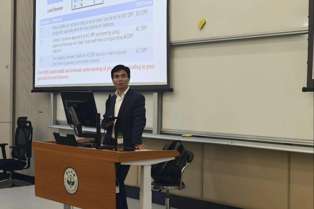 报告伊始,王钦副教授结合个人在美国电网公司、科研院所及香港理工大学的工作经历,简要介绍了当前新型电力系统的发展背景。他指出,随着可再生能源高比例接入,以及电动汽车、虚拟电厂等新型负荷的快速发展,电力系统正从传统的“单向输电”模式,转变为高度耦合、强不确定性的复杂系统,这对安全稳定运行和经济调度提出了更高要求。围绕“如何在不牺牲安全性的前提下降低系统运行成本”这一核心问题,王钦副教授通过典型算例,介绍了国内外在新型电力系统调度领域的最新进展和典型思路,帮助同学们全面把握相关研究。