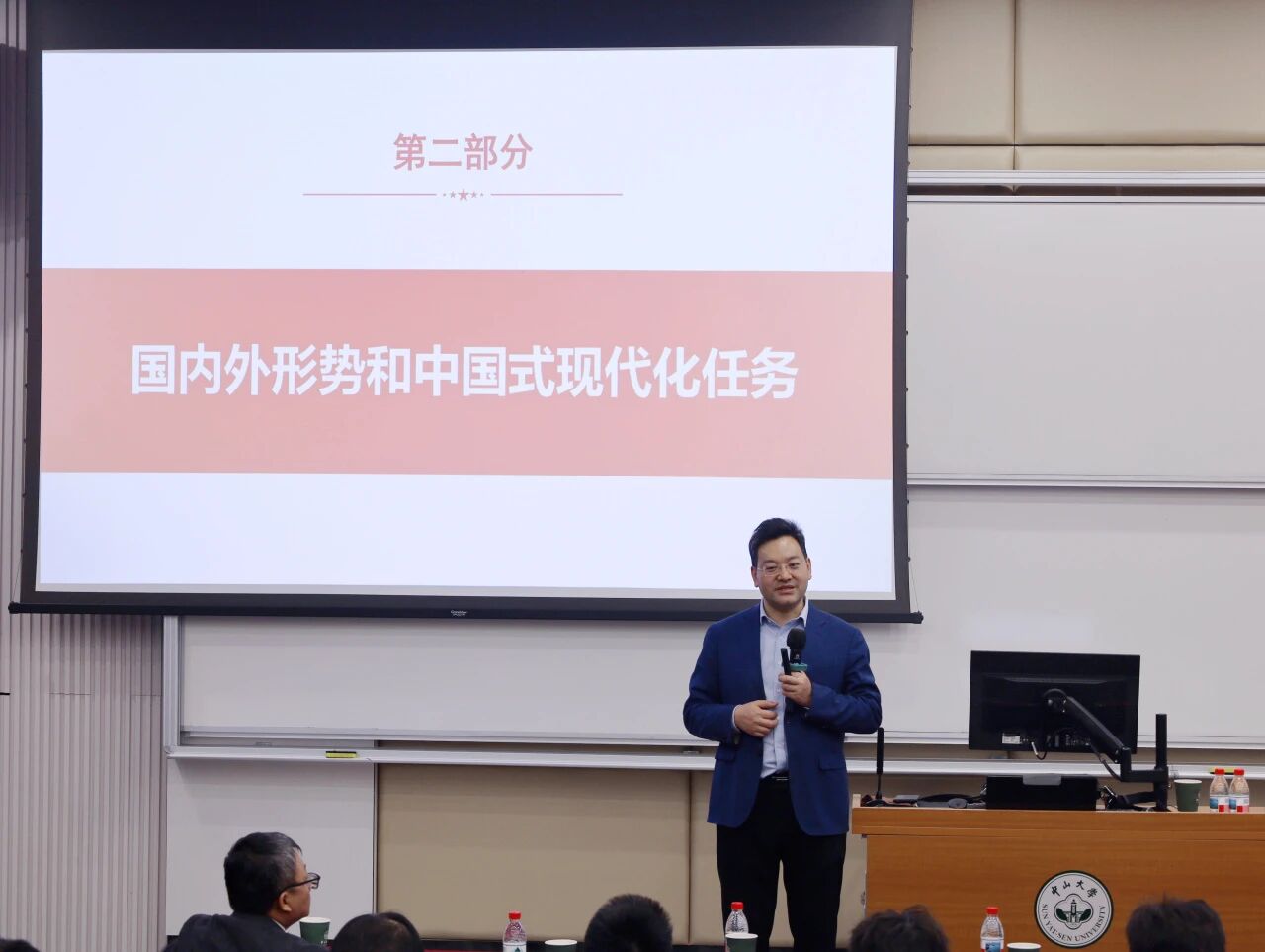 张浩教授以《深悟党的二十届四中全会精神实质,扛起“十五五”奋进新使命》为主题展开讲授。他指出,党的二十届四中全会是在“十四五”规划即将收官、“十五五”规划即将启动的关键时期召开的一次具有深远战略意义的重要会议。全会系统谋划了未来五年的发展蓝图,特别是在应对国际复杂局势、推动经济高质量发展和加快科技创新等领域,提出了明确的战略方向。