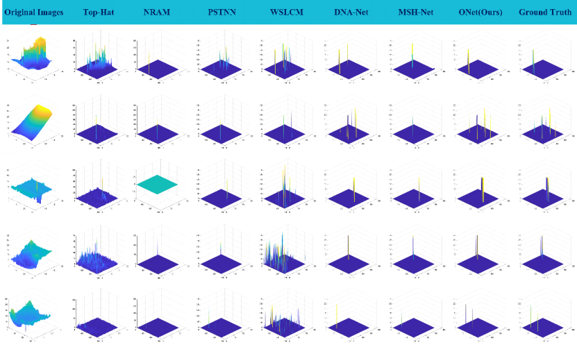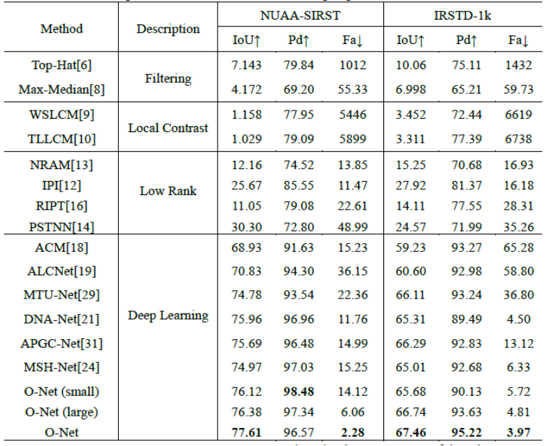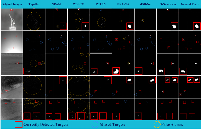 实验结果表明,O-Net在公开数据集NUAA-SIRST和IRSTD-1K上均取得了最先进的性能。在NUAA-SIRST数据集上,O-Net的交并比达到77.61%,检测率为96.57%,误检率低至2.28×10⁻⁶;在更具挑战性的IRSTD-1K数据集上,交并比仍达67.46%,检测率为95.22%。与现有主流方法相比,O-Net在保持较低参数量的同时,显著提升了检测精度与泛化能力。
