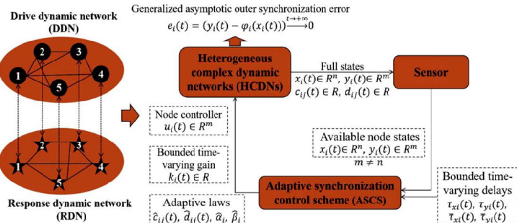 近日,中山大学系统科学与工程学院博士研究生李博博在数学领域国际知名期刊《Chaos, Solitons & Fractals》(影响因子5.6,中科院一区TOP)上发表题为“Adaptive-based generalized asymptotic outer synchronization control for heterogeneous complex dynamic networks with double time-varying delays”的研究成果,李博博为第一作者,指导老师钟令枢副教授为通讯作者,中山大学为论文第一单位。该研究针对具有未知动态连接、多维不确定参数及双重时变时延的异维复杂动态网络(HCDN)的广义渐进外同步控制问题,提出了一种由节点控制器、有界时变增益和自适应律组成的自适应同步控制方案(ASCS),使得具有不同拓扑结构的驱动-响应网络在节点间连接边完全不可利用的条件下实现了广义渐进外同步,且外同步现象涌现时网络节点间耦合连接依旧存在而非断开。该成果为复杂动态网络存在多种时延扰动、参数未知、连接不明等复杂工况下的同步调控提供了一种兼具完备性与鲁棒性的理论控制策略。