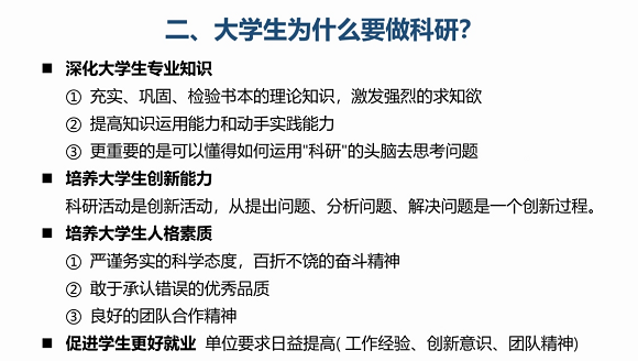 结合学院人才培养目标,发挥以党建“促学风,带科研”的作用,促进本科生提前进入实验室开展科研,本次组织生活由本科生党支部的青年教师专职辅导员张岐良老师为同学们进行了主题为“本科生如何做科研”的指导分享,从什么是科研,为什么要做科研,如何做科研,由浅入深地介绍了本科生做科研的方法论,指出科学研究的基本任务是探索、认识未知,同学们应当以自身兴趣为内驱力,平时加强对前沿领域的了解,重视论文的检索以及阅读能力,在本科生阶段提前进入实验室开展科研。